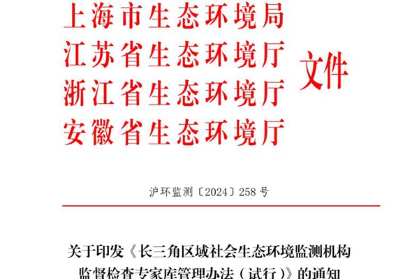 关于印发《长三角区域社会生态环境监测机构 监督检查专家库管理办法(试行)》的通知沪环监测〔2024〕258号 上海市各区生态环境局,江苏、浙江、安徽省各设区市生态环境局,各有关单位: 为充分发挥专家在社会生态环境监测机构监管工作中的技术支撑作用,提升社会生态环境监测机构监管效能,上海市、江苏省、浙江省、安徽省三省一市生态环境厅(局)联...