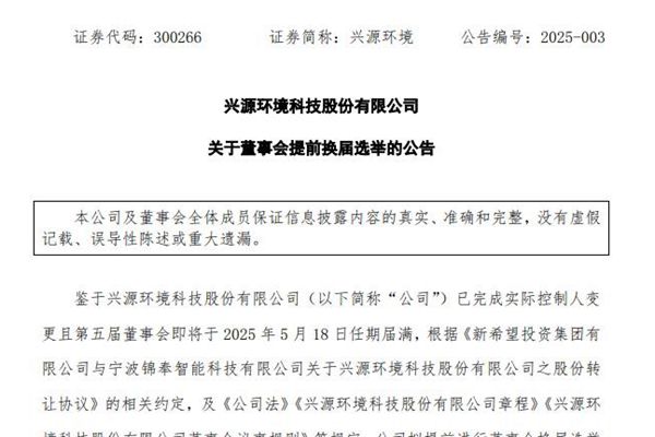 1月6日,兴源环境科技股份有限公司(简称:兴源环境)发布关于董事会提前换届选举的公告。公告显示,兴源环境已完成实际控制人变更,鉴于第五届董事会任期将于2025年5月18日届满,决定提前进行董事会换届选举。兴源环境于2025年1月6日召开董事会,审议通过了相关议案,并提名了第六届董事会的候选人。 兴源环境控股股东宁波锦奉智能科技有限公...