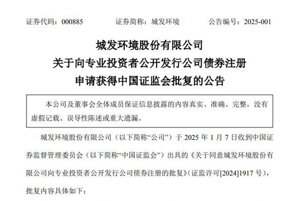 城发环境股份有限公司(简称:城发环境)公告称,公司于2025年1月7日收到了中国证监会出具的《关于同意城发环境股份有限公司向专业投资者公开发行公司债券注册的批复》(证监许可[2024]1917 号),批复包括: 一、同意公司向专业投资者公开发行面值总额不超过 15 亿元公司债券的注册申请。 二、本次发行公司债券应严格按照报送深圳证...