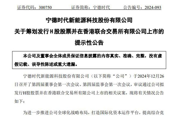 12月26日,宁德时代新能源科技股份有限公司(简称:宁德时代)发布《关于筹划发行H股股票并在香港联合交易所有限公司上市的提示性公告》。据该公告,为进一步推进全球化战略布局,打造国际化资本运作平台,提高综合竞争力,宁德时代拟发行境外上市外资股(H股)股票并申请在香港联合交易所有限公司(下称“香港联交所”)主板挂牌...