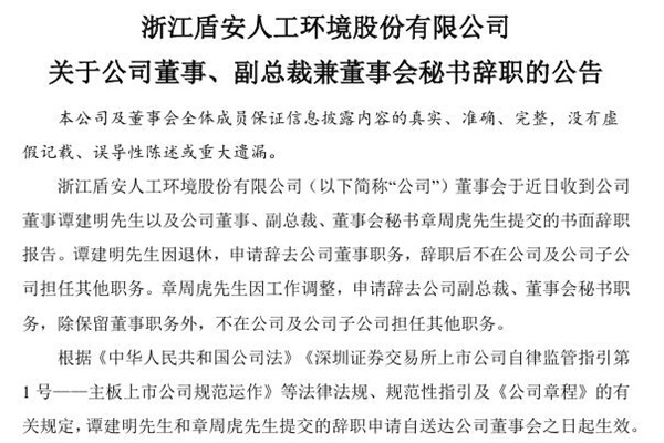 2024年12月28日,浙江盾安人工环境股份有限公司发布《关于公司董事、副总裁兼董事会秘书辞职的公告》。图源:盾安环境公告 公告显示,盾安环境董事会于近日收到公司董事谭建明先生以及公司董事、副总裁、董事会秘书章周虎先生提交的书面辞职报告。谭建明先生因退休,申请辞去公司董事职务,辞职后不在公司及公司子公司担任其他职务。章周虎先生因工作...