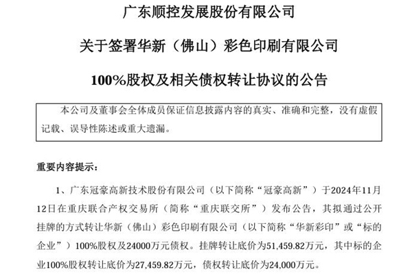 2024年12月13日,广东顺控发展股份有限公司发布《关于签署华新(佛山)彩色印刷有限公司100%股权及相关债权转让协议的公告》。图源:顺控发展公告 公告显示,顺控发展与广东恒则顺一号企业管理合伙企业(有限合伙)组成联合体,参与了华新(佛山)彩色印刷有限公司100%股权及24000万元债权摘牌。顺控发展已经与冠豪高新正式签署《华新(...