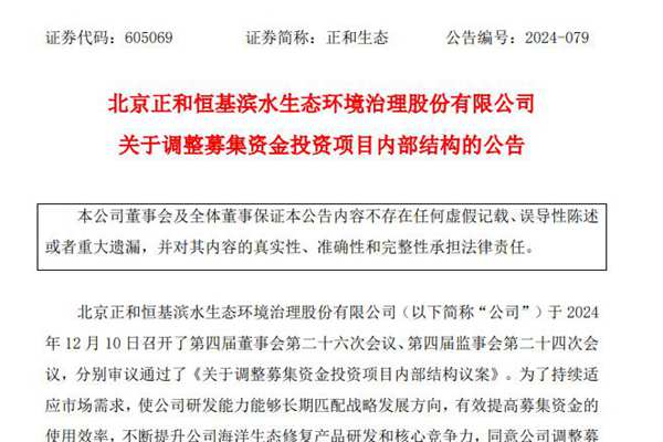 北京正和恒基滨水生态环境治理股份有限公司(简称:正和生态)近日公告称,公司拟调整募集资金投资项目——生态保护与环境治理研发能力提升项目的内部结构,在原有课题的基础上新增“活力海岸模式构建与示范应用”,旨在持续适应市场需求,使公司研发能力能够长期匹配战略发展方向,有效提高募集资金的使用效率...