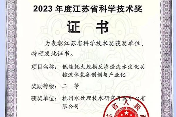 砥砺深耕,笃行致远。近来,杭州水处理科技创新频结硕果,再次传来喜讯——由江苏大学牵头,杭州水处理技术研究开发中心有限公司等单位共同完成的“低能耗大规模反渗透海水淡化关键流体装备创制与产业化”项目荣获江苏省2023年度科技进步二等奖。 自主创新 效益显著 海水淡化是解决水资源危机的战略...