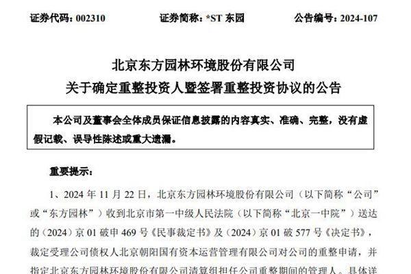 据北京东方园林环境股份有限公司(简称:*ST东园,原“东方园林”)公告,12月3日,东方园林和管理人已经分别与国联基金联合体(由国联产业投资基金管理(北京)有限公司、海南瑞科控股实业有限公司组成)及北京国朝东方绿能股权投资基金合伙企业(有限合伙)(由国联产投发起设立的专项重整基金)、北京朝阳环境集团有限公司签署...