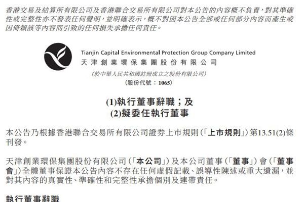 港股上市公司天津创业环保集团股份有限公司(简称:天津创业环保)11月29日公告称,公司董事会于今日收到董事潘光文先生的书面辞职报告。因工作调整原因,潘光文先生申请辞去本公司第九届董事会董事及所任董事会各专业委员会委员职务。上述辞职申请自召开股东会选举产生新任董事后生效。潘光文先生未持有公司股份,并确认与本公司董事会无任何意见分歧,且无...