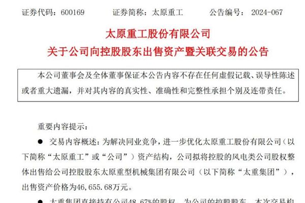 太原重工股份有限公司(简称:太原重工)12月2日公告,公司拟将控股的风电类公司股权(包括公司持有的太原重工新能源装备有限公司39.782%股权、太原重工持有的定襄县能裕新能源有限公司100%股权)整体出售给公司控股股东太原重型机械集团有限公司(以下简称“太重集团”),出售资产价格为4.67亿元。 太重集团直接...