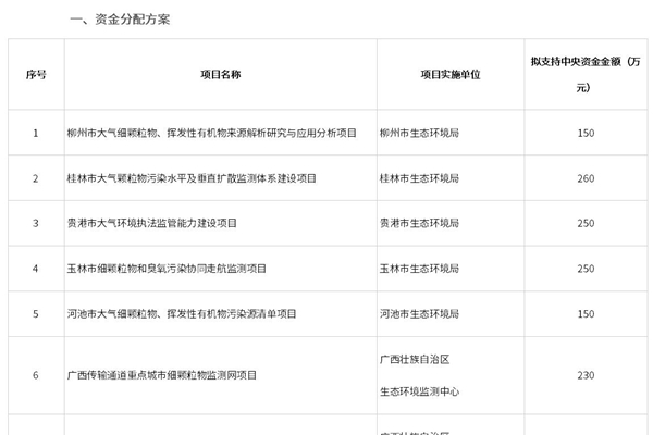 广西壮族自治区生态环境厅关于2025年中央大气污染防治资金(提前批)项目分配方案的公示 根据《中央对地方专项转移支付管理办法》《大气污染防治资金管理办法》《中央大气污染防治资金广西管理实施细则(试行)》等有关规定,现对《财政部关于提前下达2025年大气污染防治资金预算的通知》(财资环〔2024〕134号)中下达广西的2025年中央大气污...