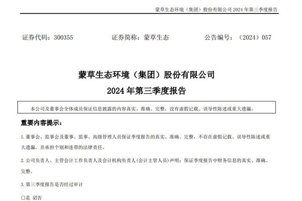 蒙草生态环境(集团)股份有限公司(简称:蒙草生态)近日发布《2024 年第三季度报告》,前三季度实现营收约11.81亿元,同比减少1.15%;归属于上市公司股东的净利润约4999万元,同比减少82.31%;基本每股收益0.03元,同比减少83.33%。图源:蒙草生态公告 公开资料显示,蒙草生态主要依托乡土种源保障及生态大数据导航,开...