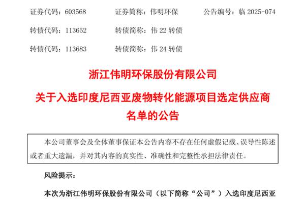 浙江伟明环保股份有限公司(简称:伟明环保)公告称,公司近日收到印度尼西亚主权投资基金PT Danantara Investment Management 发来的通知,确定公司正式入选印度尼西亚环境友好型废物转化能源项目选定供应商名单。 伟明环保表示,公司具备垃圾焚烧发电技术研发、设备制造、项目投资建设运营方面突出的综合实力,本次入选...
