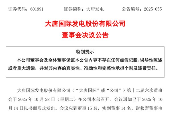 大唐国际发电股份有限公司(简称:大唐发电)于2025年10月28日召开第十二届六次董事会,审议通过《关于选举公司第十二届董事会董事长的议案》、《关于调整公司第十二届董事会专门委员会委员的议案》、《关于2025年第三季度报告的议案》、《关于大唐汕头新能源有限公司增资扩股的议案》、《关于吸收合并大唐平山新能源有限公司的议案》等。 同意李...