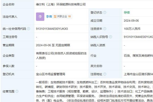 天眼查显示,维尔利(上海)环保能源科技有限公司于9月6日成立,法定代表人为李倩,注册资本100万元,经营范围包含:生物质能技术服务;生物质燃料加工;农林牧渔业废弃物综合利用等。 股权穿透显示,该公司由维尔利旗下维尔利(常州)生物能源有限公司全资持股。图源:天眼查...