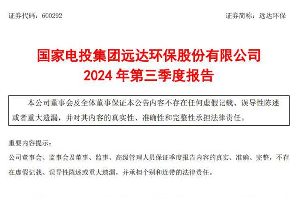 国家电投集团远达环保股份有限公司(简称:远达环保)近日发布《2024 年第三季度报告》,前三季度共实现营收约30.96亿元,同比增加6.69%;归属于上市公司股东的净利润约8837万元,同比减少0.34%;扣非净利润8659.72万元,同比增长60.49%;经营活动产生的现金流量净额为4.17亿元,同比增长143.77%;报告期内,远...