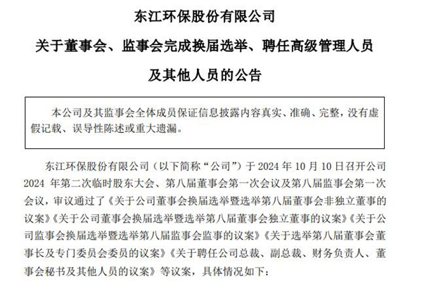 2024年10月11日,东江环保股份有限公司发布《关于董事会、监事会完成换届选举、聘任高级管理人员及其他人员的公告》。图源:东江环保股份有限公司公告 公告显示,公司第八届董事会由 9 名董事组成,其中非独立董事 6 名、独立董事 3 名,具体情况如下: 1、执行董事:王碧安(董事长)、李向利、余帆 2、非执行董事:王石、刘晓轩、...