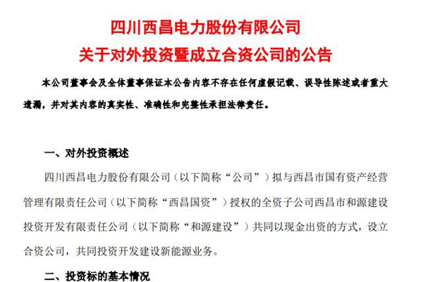 2024年10月11日,四川西昌电力股份有限公司发布《关于对外投资暨成立合资公司的公告》。 四川西昌电力股份有限公司拟与西昌市国有资产经营管理有限责任公司授权的全资子公司西昌市和源建设投资开发有限责任公司共同以现金出资的方式,设立合资公司,共同投资开发建设新能源业务。图源:四川西昌电力股份有限公司公告 名称:西昌和丽新能源开发有限...