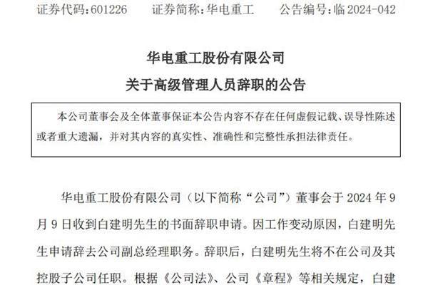 9月11日,华电重工股份有限公司(简称:华电重工)公告称,因工作变动原因,白建明先生申请辞去公司副总经理一职。公告指出,辞职后,白建明将不在公司及旗下子公司任职。该辞职申请自董事会收到之日起生效。 公开资料显示,华电重工是中国华电科工集团有限公司的核心业务板块及资本运作平台,成立于2008年12月,主要提供物料输送、热能、工业噪声治...