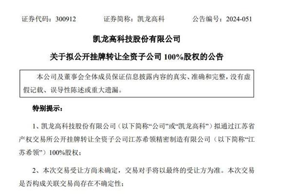 凯龙高科技股份有限公司(简称:凯龙高科)近日发布《关于拟公开挂牌转让全资子公司 100%股权的公告》,表示将通过江苏省产权交易所公开挂牌转让全资子公司江苏希领精密制造有限公司(以下简称“江苏希领”)100%股权,挂牌转让底价为 10,082.83 万元。如本次股权转让顺利完成,江苏希领不再纳入凯龙高科合并报表范...