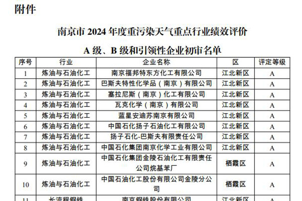 南京市2024年度重污染天气重点行业绩效评价A级、B级和引领性企业初审名单公示 根据《关于印发重污染天气重点行业应急减排措施制定技术指南》(环办大气函〔2020〕340号)《江苏省生态环境厅重污染天气重点行业绩效分级工作程序》(苏环办〔2024〕36号)《关于开展重点企业重污染天气绩效评级提升专项帮扶行动的通知》(宁环便函〔2024〕7...