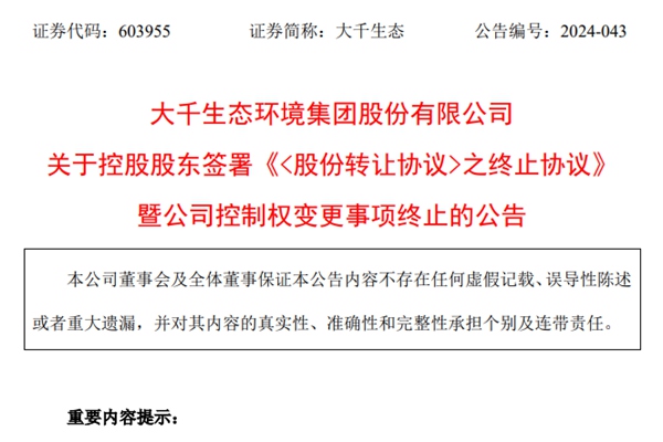 2024年8月12日,大千生态环境集团股份有限公司(下称“大千生态”)发布公告,明确公司控制权变更事项终止。 事件回顾:2024年1月16日,大千生态环境集团股份有限公司控股股东江苏大千投资发展有限公司、实际控制人栾剑洪、范荷娣与北京天盛益和科技发展合伙企业签署了《股份转让协议》大千投资拟向天盛益和协议转让其...