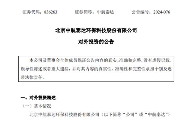 北京中航泰达环保科技股份有限公司8月12日发布《对外投资的公告》。公告显示,公司根据战略发展需求,拟投资人民币 510.00 万元,以“增资+股权转让”方式持有西安伟宏能源科技有限公司51.00%的股权。 此外,中航泰达本次拟对外投资的金额为 510.00 万元占公司最近一期(2023 年)经审计总资产的 0...