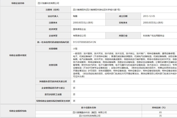 四川浩康科技有限公司35%股权在北京产权交易所挂牌,转让底价1455.993万元,信息披露结束日期2024年8月26日,转让方为四川化材科技有限公司。 四川浩康科技有限公司 成立日期2013年12月5日,注册资本2000万元,规模小型,属于国有参股企业,四川猎鹰融合科技(集团)有限公司持股65%,四川化材科技有限公司持股35%,经...