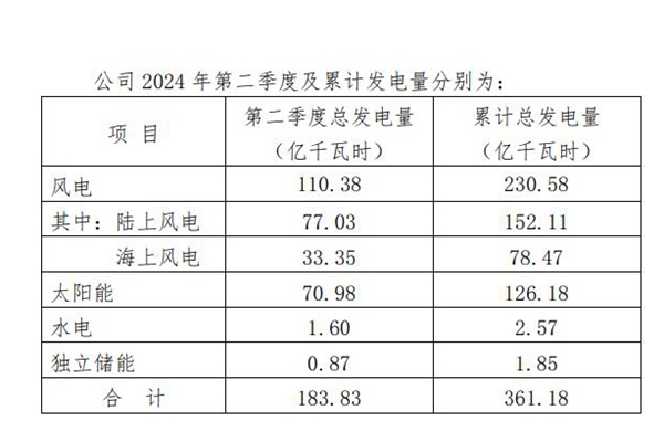 中国三峡新能源(集团)股份有限公司发布2024年第二季度发电量完成情况公告,截至2024年6月30日,第二季度总发电量183.83亿千瓦时,较上年同期增长28.47%。 其中, 风电完成发电量110.38亿千瓦时,较上年同期增长7.71%(陆上风电完成发电量77.03亿千瓦时,较上年同期增长3.52%,海上风电完成发电量33.35亿...