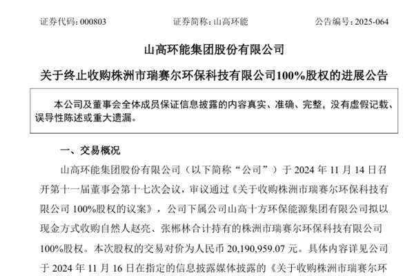 因原协议约定的交易先决条件未达成,山高环能集团股份有限公司(简称:山高环能)终止收购株洲市瑞赛尔环保科技有限公司100%股权。山高环能表示,本次收购公司未支付股权款,不存在违约情形。终止本次收购不会对公司现有经营业绩及财务状况产生不利影响,不存在损害公司及全体股东利益的情形。公司后续将继续聚焦主营业务发展,努力做好经营管理,推动公司持...