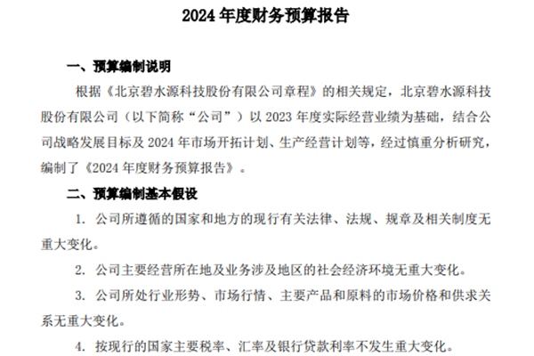 2024年4月4日,北京碧水源科技股份有限公司(下称“碧水源”)《2024年度财务预算报告》发布。报告内容显示,碧水源以2023年度实际经营业绩为基础,结合公司战略发展目标及 2024 年市场开拓计划、生产经营计划等,经过慎重分析研究,目标2024年度公司营业收入同比增长10%-20%,归母净利润同比增长10%...