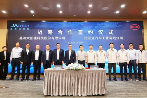 4月9日,晶澳太阳能科技股份有限公司(简称“晶澳科技”)与比亚迪汽车工业有限公司(简称“比亚迪”)在深圳比亚迪总部举行战略合作签约仪式。晶澳科技副总裁、智慧能源事业部总经理李栋,比亚迪储能及新型电池事业部副总经理张金龙代表双方签署协议。晶澳科技执行总裁杨爱青、助理总裁张凤海,比亚迪储能及...
