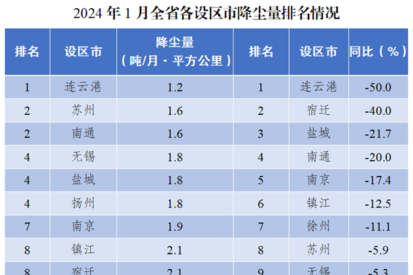 为进一步推进全省环境空气质量改善,按期保质完成年度大气污染防治攻坚目标任务,江苏省生态环境厅每月对13个设区市降尘量进行排名。 2024年1月(统计时段为1日—31日),13个设区市中降尘量由小到大依次排序为: 连云港、苏州(南通并列)、无锡(盐城、扬州并列)、南京、镇江(宿迁并列)、淮安(泰州并列)、常州、徐州; ...