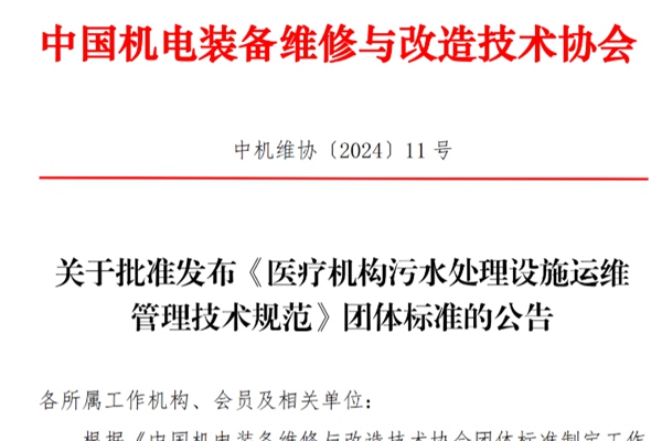 2024年1月26日发布,《医疗机构污水处理设施运维管理技术规范》(T/CAMER 024—2024)已于2月1日启动施行。该文件规定了医疗机构污水处理设施运维技术规范的术语和定义、总体要求、污水处理系统运维管理、处理工艺运维管理、在线监测系统和控制系统运维管理、安全与应急管理以及运行记录的管理要求。 本文件适用于综合性医...