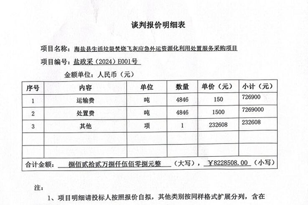 海盐县生活垃圾焚烧飞灰应急外运资源化利用处置服务采购项目开标,谈判报价为822万多,中标方为浙江合力海科新材料股份有限公司。服务期限21个月。 总体需求: (1)需外运处置量约为8吨/日,不排除后期技术改造等原因导致外运处置量变化,由此产生的风险费用,由投标人自行考虑计入本次投标报价中。 (2)投标人承担飞灰资源化利用处置的运输...
