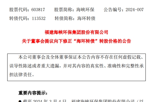 福建海峡环保集团股份有限公司近日发布《关于董事会提议向下修正“海环转债”转股价格的公告》。 截至2024 年 3 月 4 日,福建海峡环保集团股份有限公司股票已出现在任意三十个连续交易日中至少十五个交易日的收盘价格低于当期转股价格 85%(即 5.23 元/股)的情形,触发“海环转债”...