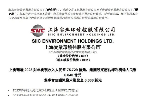 上海实业环境控股有限公司(简称:上海实业环境)近日公布2023财年业绩情况,共实现收入人民币 75.729 亿元,集团股东应占净利润达人民币6.040 亿元,董事会建议派发末期股息 0.006 新元 • 2023财年收入同比减少8.8%至人民币75.73亿元 • 2023财年净利同比减少9.1%至人民币10.1...