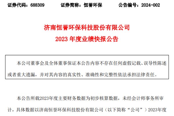2024年2月22日,济南恒誉环保科技股份有限公司(下称“恒誉环保”)发布《2023年度业绩快报公告》。公告内容显示,2023年恒誉环保营业总收入约1.64亿元,较上年同期减少0.84%;营业利润1927.35万元,较上年同期增长15.91%;利润总额1940.35万元,较上年同期增长14.03%;归属于母公司...