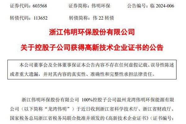 浙江伟明环保股份有限公司(简称:伟明环保)近日公告称,公司100%控股子公司温州龙湾伟明环保能源有限公司(以下简称“龙湾伟明”)于近日收到浙江省科学技术厅、浙江省财政厅、国家税务总局浙江省税务局联合批准并颁发的《高新技术企业证书》。 龙湾伟明于2013年08月20日成立,注册资本1亿元,经营范围包括城市生活垃...
