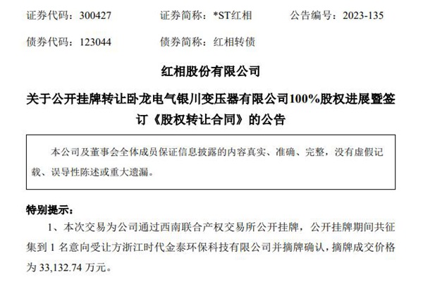 11月25日,红相股份有限公司(简称:*ST红相)发布关于公开挂牌转让卧龙电气银川变压器有限公司(下称“银川变压器”)100%股权进展暨签订《股权转让合同》的公告。 公告明确,通过西南联合产权交易所公开挂牌,意向受让方浙江时代金泰环保科技有限公司(下称“金泰环保”)正式摘牌确认,将以3...