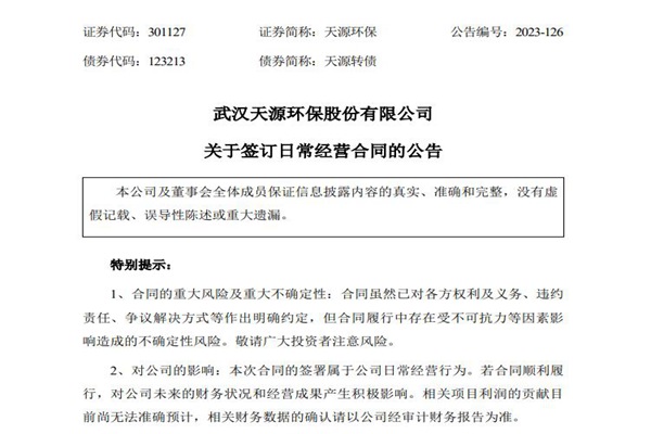 11月14日,武汉天源环保股份有限公司(简称:天源环保)发布《关于签订日常经营合同的公告》。公告显示,天源环保与上海康恒环境股份有限公司(下称“康恒环境”)作为联合体,共同与赫章县住房和城乡建设局签订了《赫章县生活垃圾焚烧发电项目特许经营协议》,本项目总投资为38,508.21万元。 项目概况 1、项目名称...