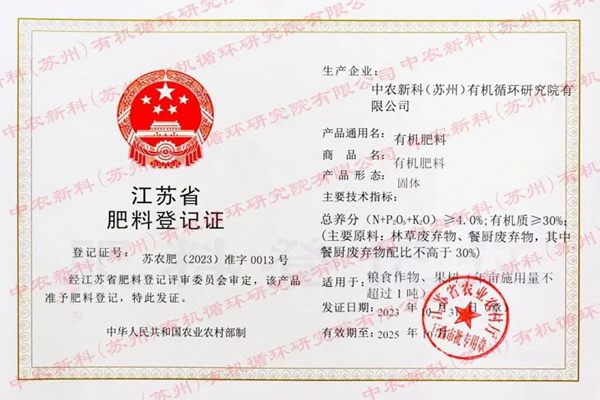 近日,中国农业大学有机循环研究院(苏州)利用自行研发的微生物菌剂,以餐厨废弃物、林草废弃物等为原料生产的有机肥产品正式获得有机肥料登记证,这也是国内首张以餐厨废弃物为原料好氧发酵工艺的有机肥料登记证。 登记证的获得标志着在全国无废城市建设和垃圾分类全面推进背景下餐厨废弃物的肥料化利用打通了一条新的途径,为环太湖地区城乡有机废弃物资源...