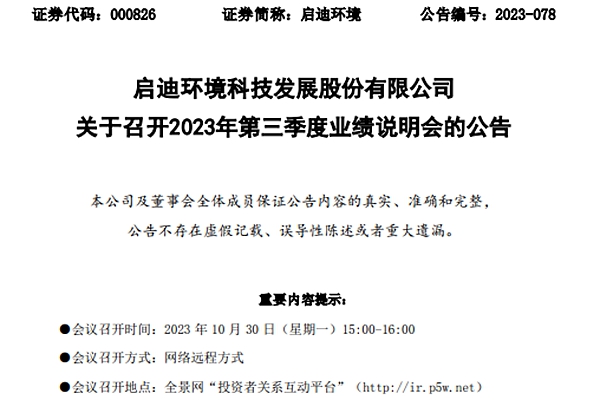 近日,启迪环境科技发展股份有限公司发布《关于召开2023年第三季度业绩说明会的公告》,明确,公司将于2023年10月30日(星期一)15:00-16:00以网络远程方式召开2023年第三季度业绩说明会。本次出席年度业绩说明会的人员:董事长王翼先生、董事兼总经理宋澜涛先生、财务总 监畅敞先生、董事会秘书张维娅女士。 公告提示,启迪环境...
