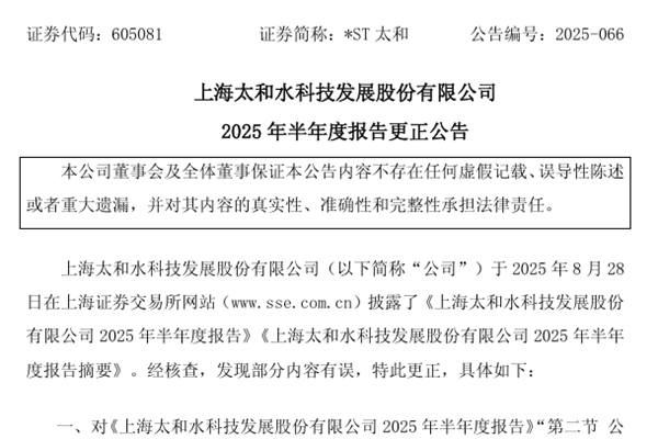 上海太和水科技发展股份有限公司(简称:*ST太和)近日公告称,经核查,发现公司《2025年半年度报告》部分内容有误,特此更正↓ 一、对“第二节 公司简介和主要财务指标”之“七、公司主要会计数据和财务指标”之“(一) 主要会计数据”中的“上年...