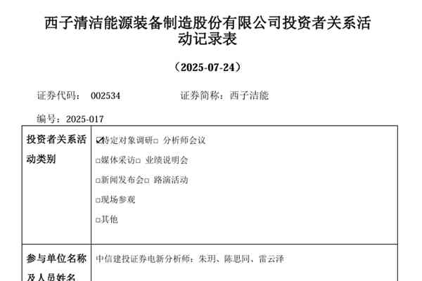 西子清洁能源装备制造股份有限公司(简称:西子洁能)近日公告称,公司于2025年7月24日进行了投资者关系活动,主要介绍公司的基本情况及业务。 西子洁能于1955年建厂,2002年加入西子电梯集团,2011年深交所挂牌上市,2022年更名为西子清洁能源装备制造股份有限公司。公司主要从事余热锅炉、清洁环保能源发电装备等产品咨询、研发、生...