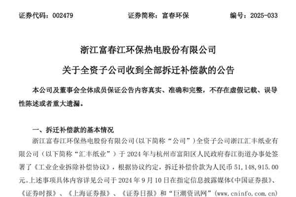 浙江富春江环保热电股份有限公司(简称:富春环保)近日公告称,目前,全资子公司浙江汇丰纸业有限公司(下称“汇丰纸业”)已收到全部拆迁补偿款。 据悉,汇丰纸业于2024年与杭州市富阳区人民政府春江街道办事处签署了《工业企业拆除补偿协议》,根据协议约定,拆迁补偿价款为人民币51,148,915.00元。 2025...