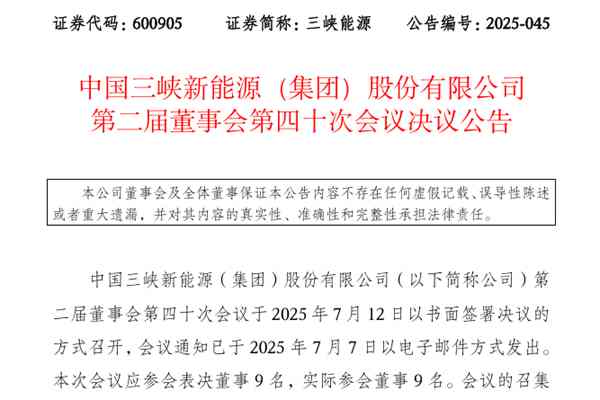 中国三峡新能源(集团)股份有限公司(简称:三峡能源)近日公告称,公司第二届第四十次董事会会议于2025年7月12日以书面签署决议的方式召开。会议审议通过了《关于成立三峡集团辽宁能源投资有限公司的议案》等文件。 此前,三峡集团与辽宁省人民政府签署了战略合作框架协议。2024年底,三峡集团董事长、党组书记刘伟平,总经理、党组副书记李富民...