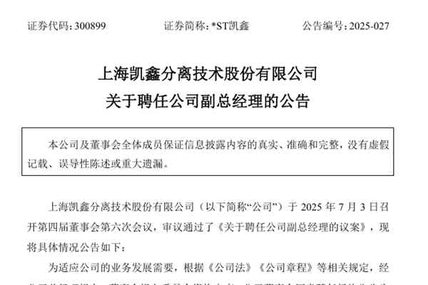 上海凯鑫分离技术股份有限公司(简称:*ST凯鑫,下称“凯鑫分离”)近日公告称,为适应公司的业务发展需要,根据《公司法》《公司章程》等相关规定,经公司总经理提名,董事会提名委员会资格审查,公司董事会同意聘任杨旗先生为公司副总经理,任期自本次董事会审议通过之日起至第四届董事会届满之日止。 杨旗先生,1964年6月...