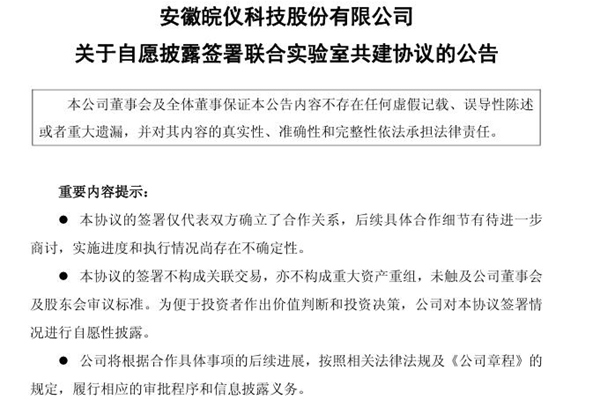 2025年06月24日,安徽皖仪科技股份有限公司发布《关于自愿披露签署联合实验室共建协议的公告》。图源:皖仪科技公告 近日,安徽皖仪科技股份有限公司与合肥综合性国家科学中心能源研究院经友好协商,达成合作意向,并签署了《联合实验室共建协议》。双方为实现在科研与需求、技术与市场、人才与产业等方面的深度对接,共同推动国内真空技术及真空装备...