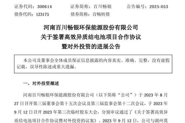 河南百川畅银环保能源股份有限公司(简称:百川畅银)近日公告称,鉴于湖州高效异质结电池项目建设受宏观环境、光伏行业市场环境变化、融资环境、项目施工实施条件、项目施工相关方配合进度等多种因素影响,致使本项目无法按原计划推进建设进度。结合公司整体发展规划及市场情况,为优化公司资源配置,降低投资风险,切实维护公司及全体股东利益,经公司与莫干山...