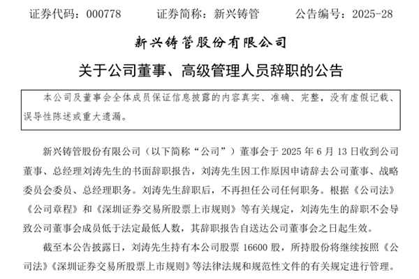 新兴铸管股份有限公司(简称:新兴铸管)近日公告称,公司已收到董事、总经理刘涛先生的书面辞职报告,刘涛先生因工作原因申请辞去公司董事、战略委员会委员、总经理职务。刘涛先生辞职后,不再担任公司任何职务。 截至本公告披露日,刘涛先生持有本公司股票16600股,所持股份将继续按照《公司法》《深圳证券交易所股票上市规则》等法律法规和规范性文件...