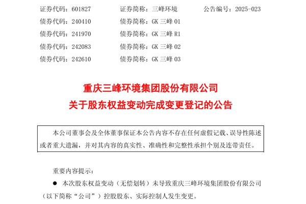 5月6日,重庆三峰环境集团股份有限公司(简称:三峰环境)公告称,公司于近日收到间接控股股东重庆水务环境控股集团有限公司《关于重庆水务环境控股集团有限公司80%股权无偿划转进展事宜的函》,函告本次无偿划转已在重庆市市场监督管理局办理完成变更登记手续。本次国有股权无偿划转完成过户登记前后,间接控股股东水务环境的股权变动情况如下:图源:三峰...