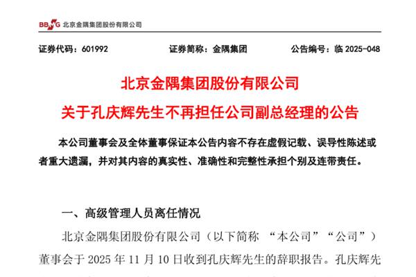 北京金隅集团股份有限公司(简称:金隅集团)公告称,公司董事会于2025年11月10日收到孔庆辉先生的辞职报告。孔庆辉先生因工作变动,请求辞去公司副总经理职务。辞去上述职务后,孔庆辉先生将继续在公司担任党委副书记职务。图源:金隅集团公告 金隅集团表示,截至公告披露日,孔庆辉先生未持有公司股份,不存在应当履行而未履行的承诺事项。孔庆辉先...